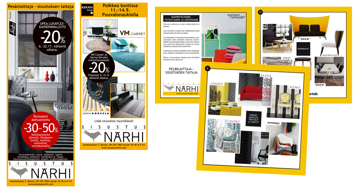 Printtimainonta, esitteet, nettisivut, ulkomainonta, teippaukset ja sisustuskuvaus.